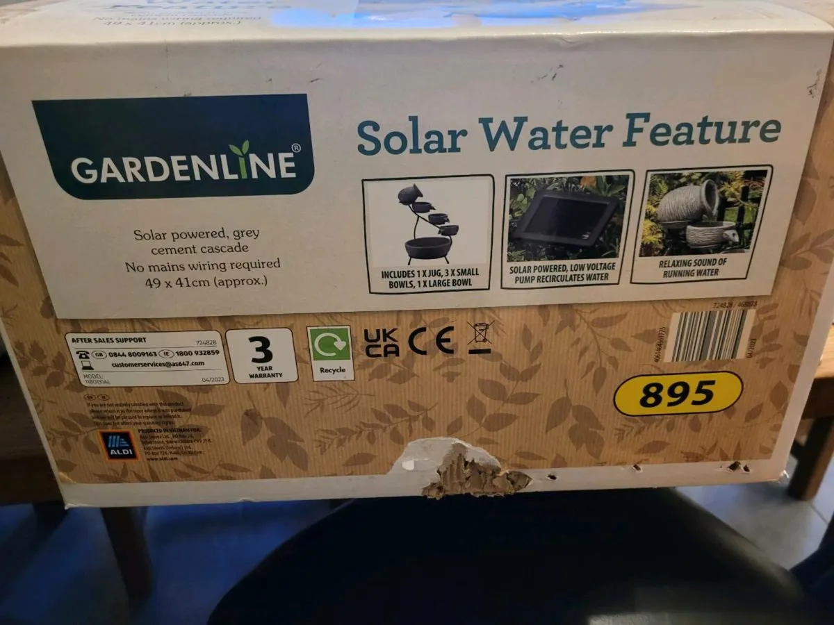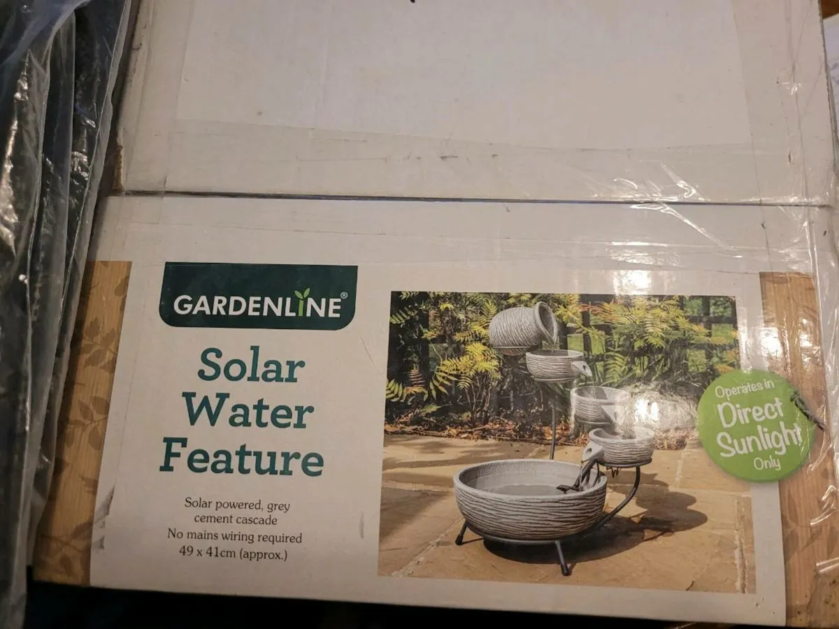 Solar water feature new €80, selling €50 50ft garden edging & pegs, new €50, selling €30 1.2M x 10 weed barrier, new €30, selling €15 All together €95, will sell for €70