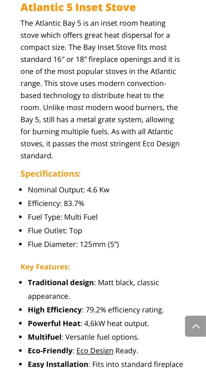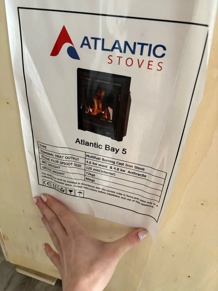 Atlantic Bay 5 insert stove. Details of stove in last picture. Incorrect stove bought and unable to return. Never taken out of original box. Collection only.