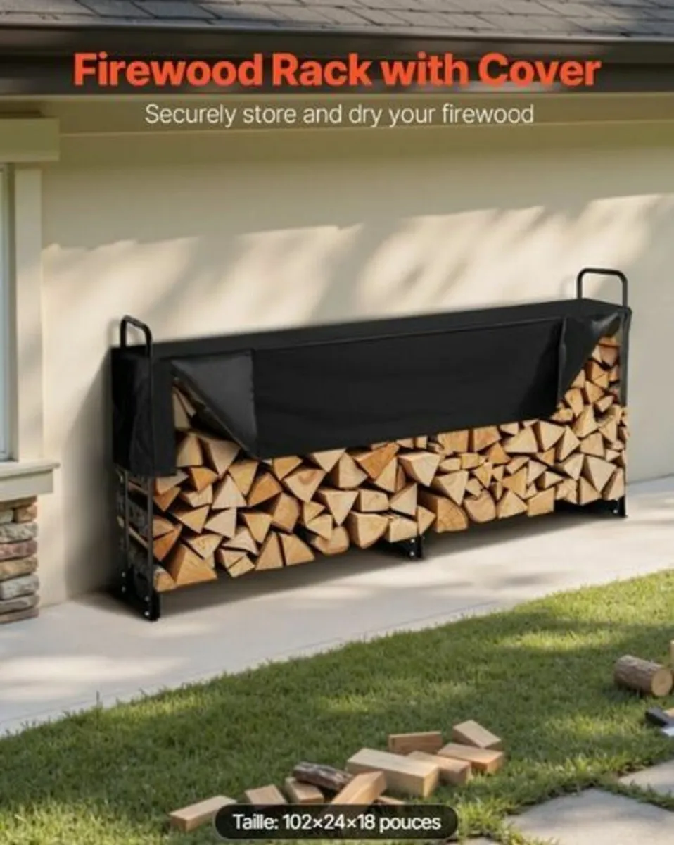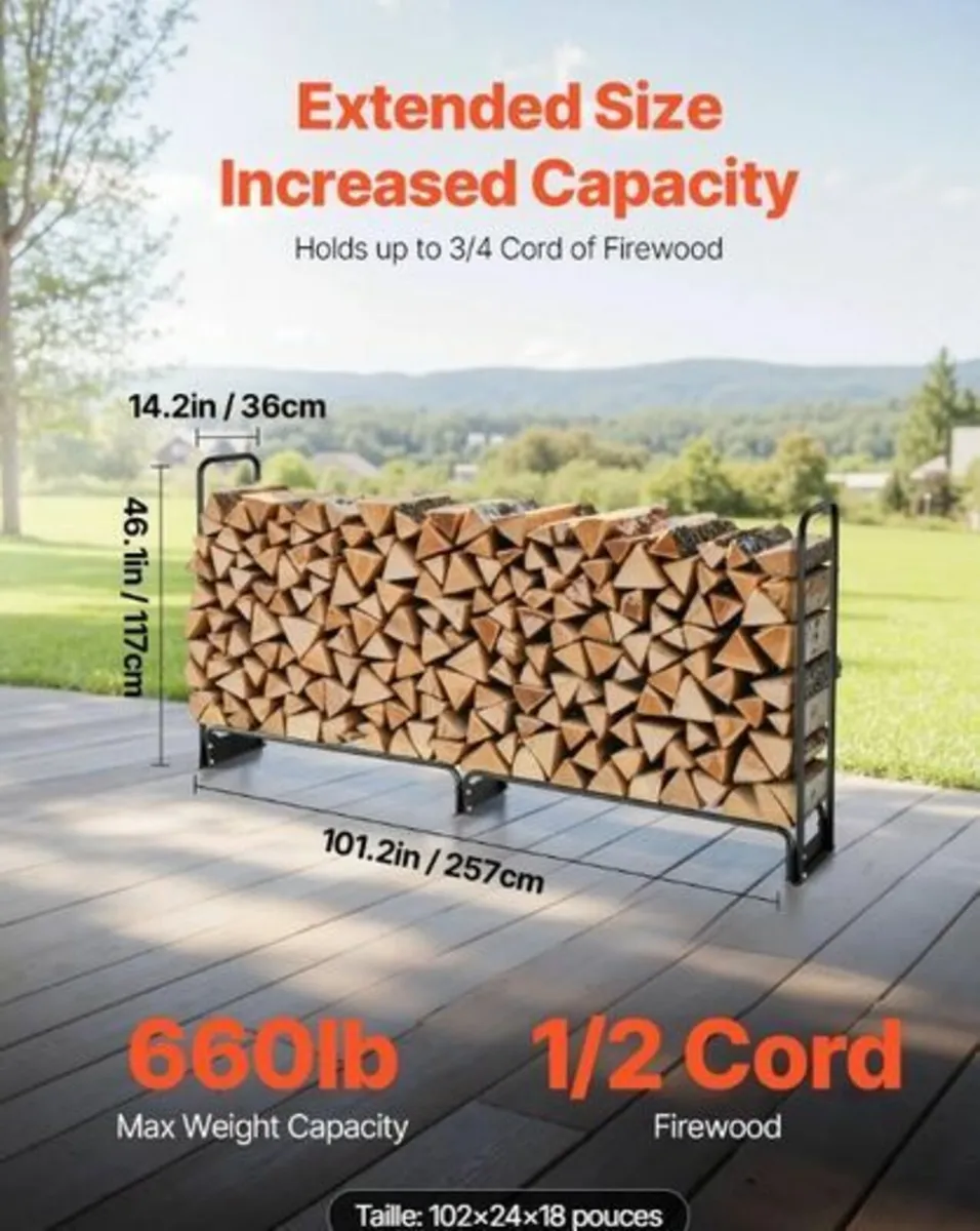 FREE DELIVERY 5-8 WORKING DAYS Available to purchase on our website https://www.mcafeesshop.com/product-page/heavy-duty-outdoor-firewood-log-rack-with-waterproof-cover 🛒 Shop securely with a VAT registered Irish trader Heavy Duty Outdoor Firewood Log Rack with Waterproof Cover – 259 x 36 x 117 cm (8.5ft x 1.2ft x 3.8ft) – Stores 1/2 Cord of Wood Features & Details Large Capacity Log Storage – Measuring 259 x 36 x 117 cm (approx. 8.5ft x 1.2ft x 3.8ft), this log rack can hold up to 1/2 cord of firewood and supports loads of up to 300 kg (660 lbs). Perfect for stacking wood neatly on your patio, in the garden, or beside your fireplace. Raised Base for Dry Wood – The 14 cm (5.5 in) raised base improves air circulation and keeps your logs off damp ground, ensuring your firewood stays dry and ready to burn. Durable & Rust-Resistant Frame – Built from powder-coated steel, this firewood holder is designed to resist rust, chipping, and corrosion, making it a long-lasting storage solution for all seasons. All-Weather Waterproof Cover – Includes a heavy-duty 600D Oxford fabric cover with UV protection and PU waterproof coating, preventing cracks, fading, and moisture damage, even in harsh conditions. Stable Design – The reinforced, widened base ensures excellent stability on grass, decking, or concrete, even during high winds or heavy snow. Easy Assembly & Access – Simple to set up with included hardware. The cover features adjustable height, Velcro straps, and a smooth zipper, allowing quick and easy access to your logs at any time. Specifications Dimensions: 259 x 36 x 117 cm (approx. 8.5ft x 1.2ft x 3.8ft) Weight Capacity: 300 kg / 660 lbs Firewood Capacity: 1/2 cord Material: Powder-coated steel + 600D Oxford fabric cover Net Weight: 10.8 kg (23.8 lbs)