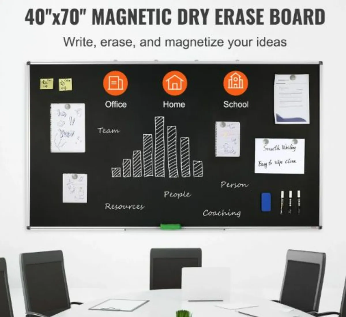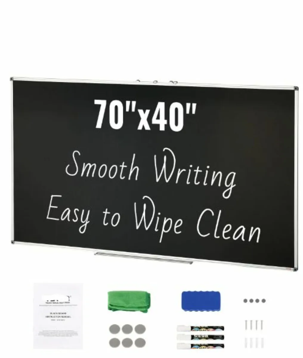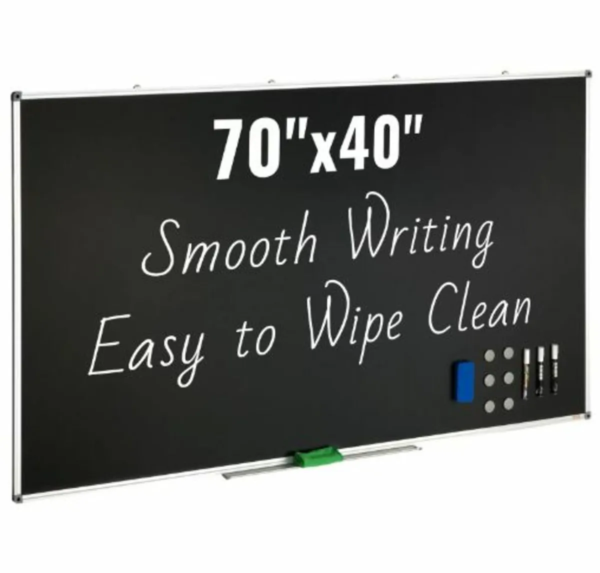 SHIPPING NATIONWIDE 2-4 WORKING DAYS Magnetic Board: 70"x40" chalk boards offer ample space to show your ideas, teaching lessons, or managing your work presentations. Ideal for group collaboration, whether it's in classrooms, offices, or homes. Smooth Writing & Easy Wiping: Our baking paint surface ensures an incredibly smooth writing experience that effortlessly wipes clean, leaving no visible scratches or ink marks, even after 1000 uses. Thanks to its strong magnetic properties, you can conveniently attach your magnetic eraser and markers to the board, ensuring they're always within reach. Sturdy Frame: Crafted with a classic silver aluminum frame, our blackboard is not only visually appealing but also exceptionally stable. The rounded ABS corners prevent unsightly scratches, making it a durable choice for repeated use. Complete Set Included: Our wall-mounted blackboard comes with everything you need to start: three markers, one eraser, six magnets, and a movable tray for easy access to writing supplies. You can also use standard dry-erase markers and erasers on our boards. Write down your thoughts and ideas, and share them with others instantly! Versatile Installation: Blackboard offers flexible installation options, allowing you to set it up horizontally or vertically to suit any space. Enjoy unmatched creativity and productivity with this versatile tool.