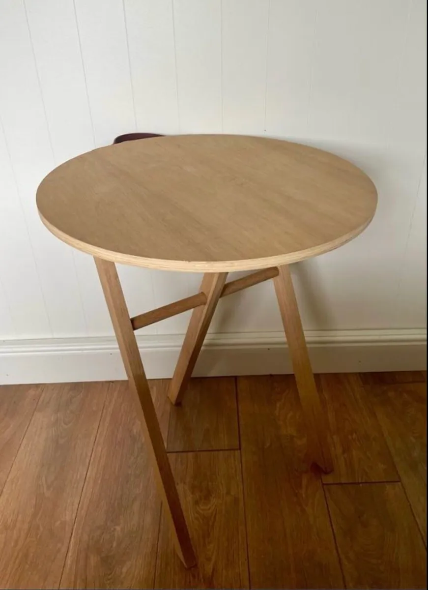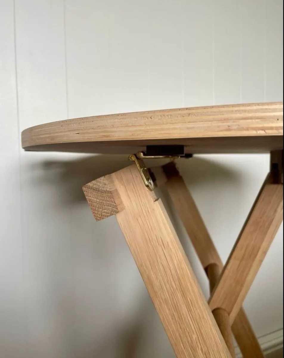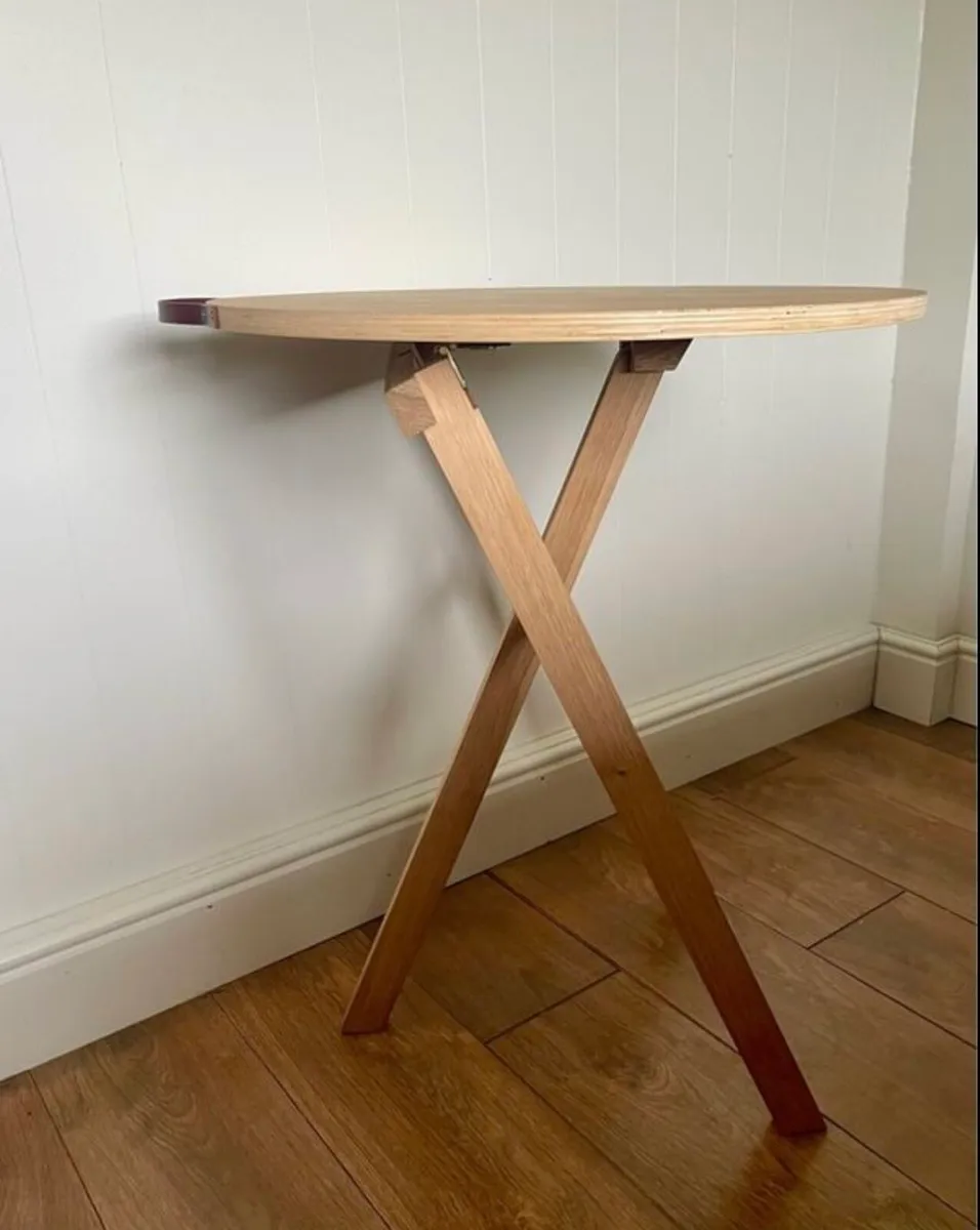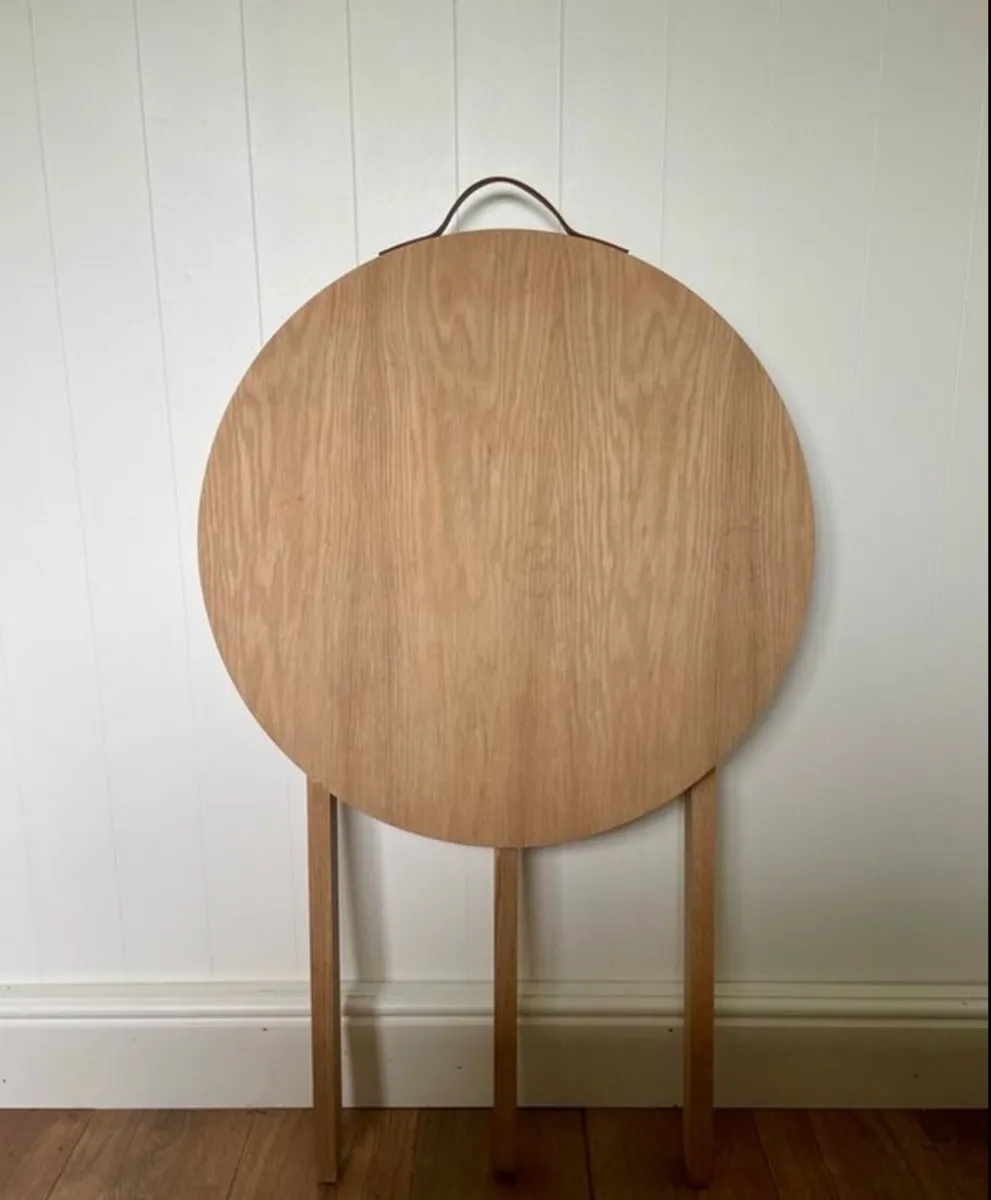 Handmade bespoke timber folding table with leather handle for hanging on wall. We loved this space saving table but no longer have a use for it. The natural timber finish can be sanded down & stained. See last photo for mark on edge of table Dimensions: 600mm Diameter 770mm Height (Dining/Cafe height) Height when folded 1000mm (excluding handle)