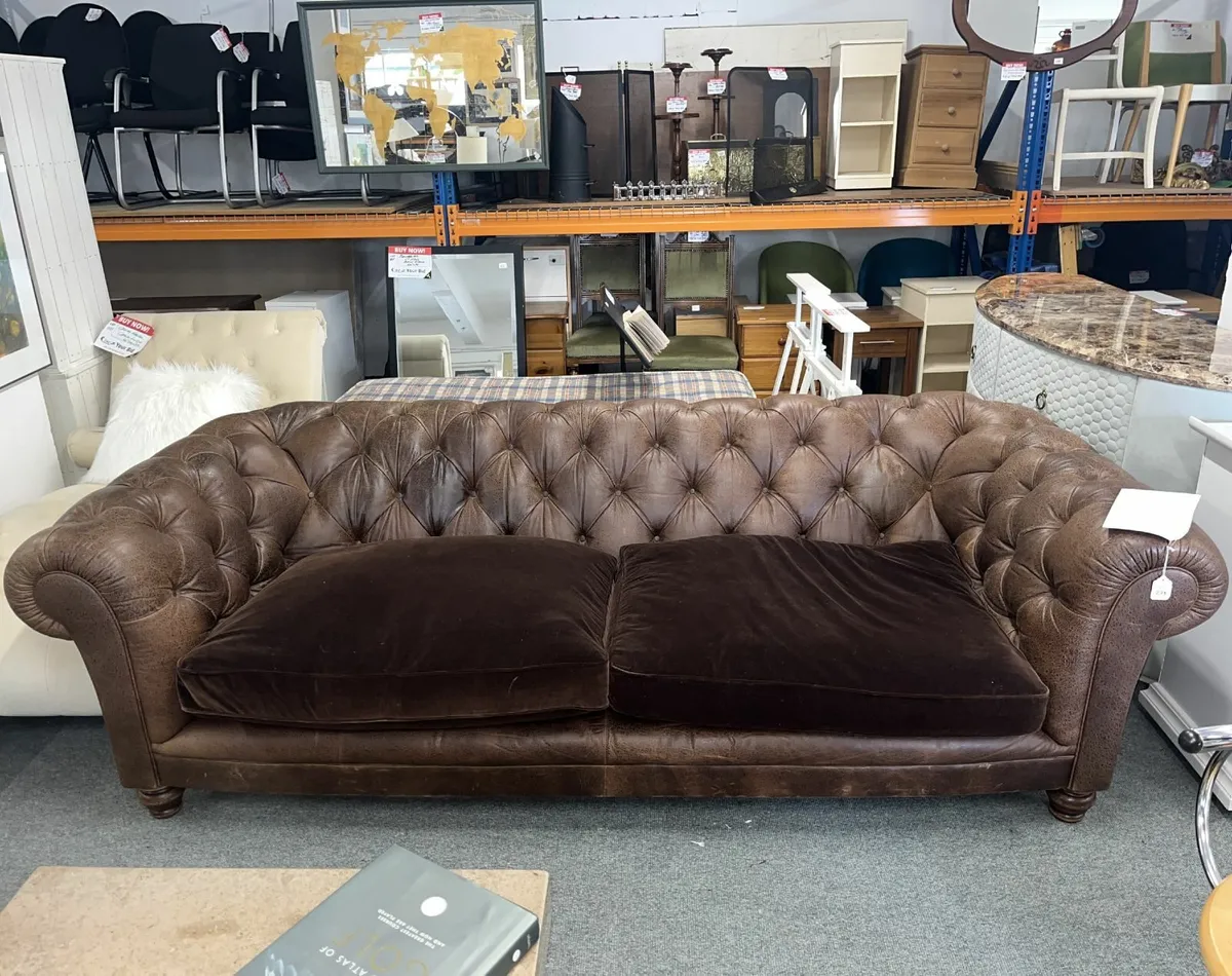 Gorgeous Medium Brown 2 1/2 seater Chesterfield Distressed Leather Sofa with chocolate brown fabric cushions, elegantly proportioned arms with soft ruched detailing and sumptuous deep buttoning on stylish turned wooden feet measuring 7ft Wide x 44in Deep x 29in High
