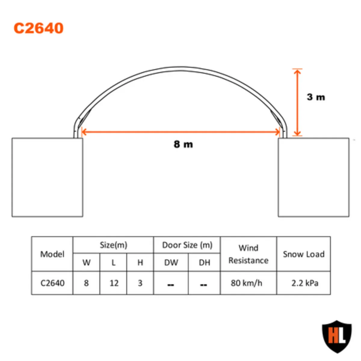 ALL PRICES EXCLUDE VAT (Military Green) GREAT FOR USE AS: . Industrial and agricultural warehouses . Construction warehouses . Vehicle shelters . Temporary shelters . Office inventory . Canopy tents Description Specifications Model C2640 Width (m) 8 Length (m) 12 Height (m) 3 Arch Interval (m) 2 Arch ø (mm) 60 x 1.80 Purlin ø (mm) 45 x 1.50 Snow Load (kPa) 2.28 Wind Load (km/h) 80 Package Size [W x L x H] (m) 0.75 x 2.67 x 0.54 KEY FEATURES: . Convenient, durable, and sturdy . High-quality, pre-fabricated, hot-galvanised steel frame . Suitable for use all year around . 100% waterproof . Fire resistant and flame retardant . UV protected . Self-cleaning . Frame lifespan of 15 years . Fabric lifespan of 7–10 years, depending on the type of fabric and environmental conditions ADVANTAGES: . No building permits required* . Economical compared to the cost involved in building a permanent structure . Easy and low-cost installation and removal . Readymade, pre-fabricated shelters . Weather safety . Extra, flexible space . Convenient, portable, and easy to transport . Easy maintenance Other sizes available for more information, contact us on [email protected] or on donedeal.ie/brianscottengineering