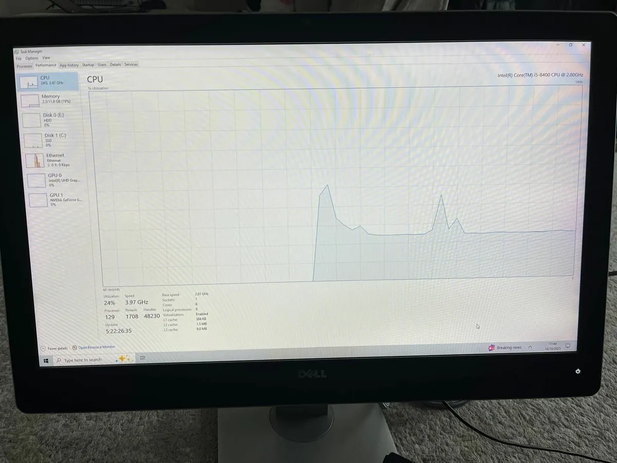 PC Dell Inspiron 3470 Core i5-8400 Operating system: Windows 10 Home Activated Processor: Intel(R) Core(TM) i5-8400U Memory: 12GB RAM Hard disk: 128 GB SSD + 1TB HDD Has two GPUs: GPU 1: Intel(R) UHD Graphics 630 (Shared memory 6 GB) GPU 2: NVIDIA GeForce GT 710 (2 GB) Includes: • DELL system unit • DELL monitor • Dell keyboard • Mouse • Dell speaker • All necessary cables for connection and power Important: The Internet works via cable! Has several installed games, as shown in the photos.