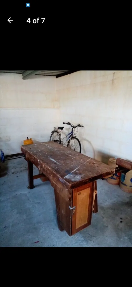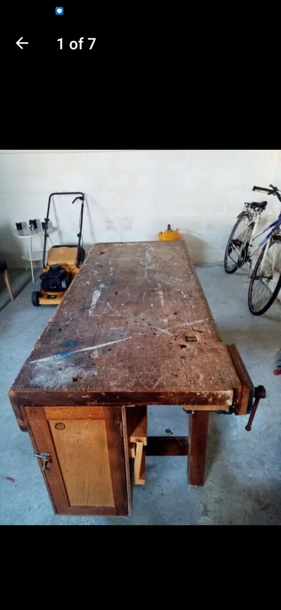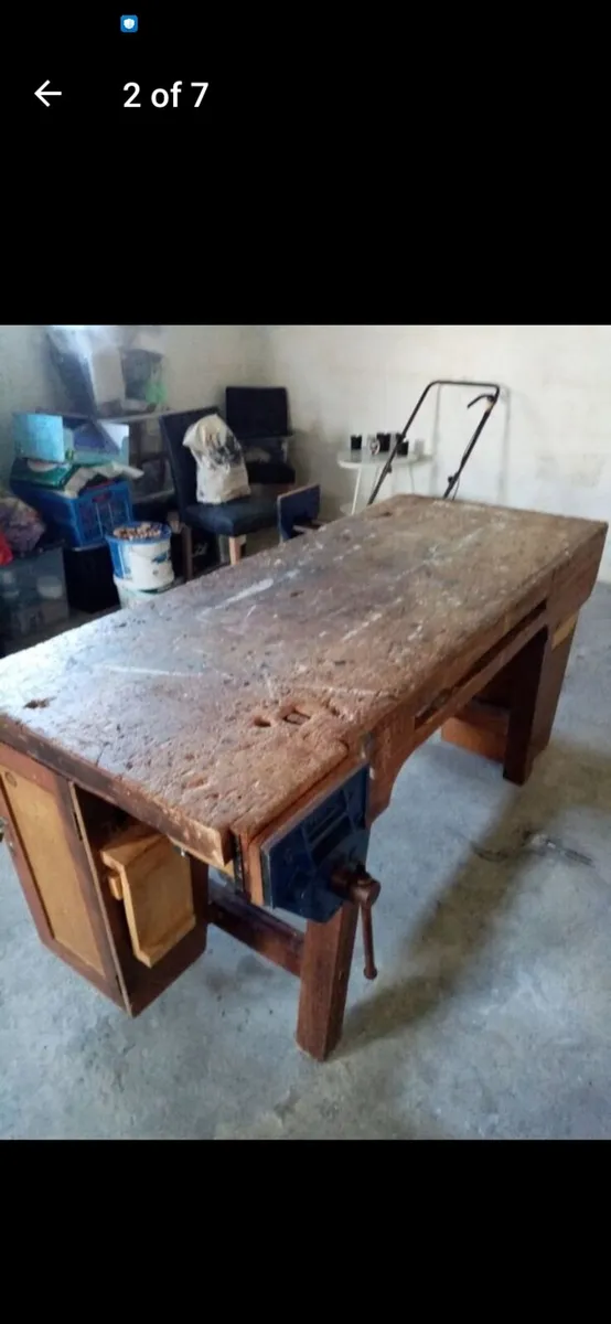 Solid carpenters work bench with storage tool cabinet and 2 vices, very heavy. Would be a great item for workshop or remove the vices for a kitchen table. Buyer collect.