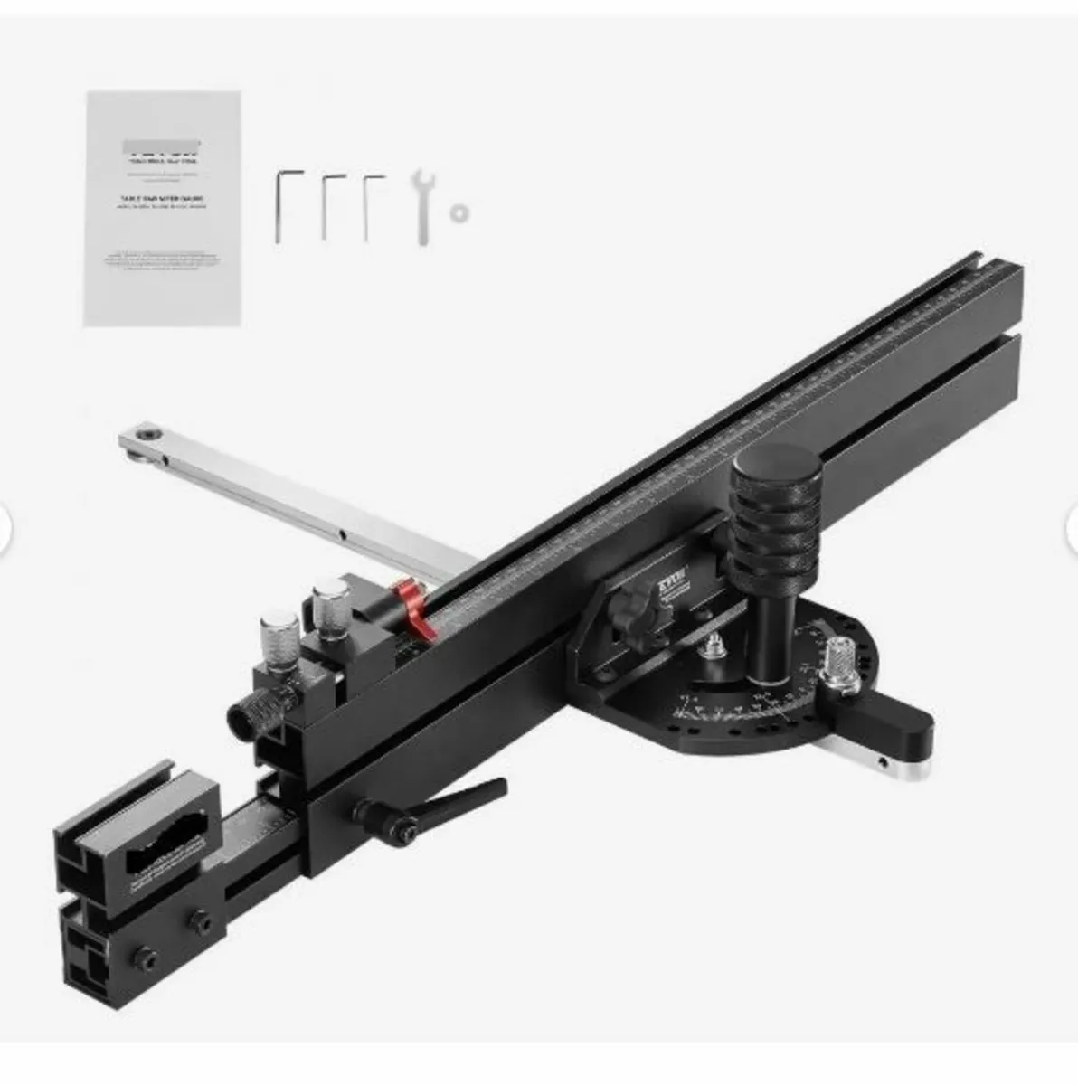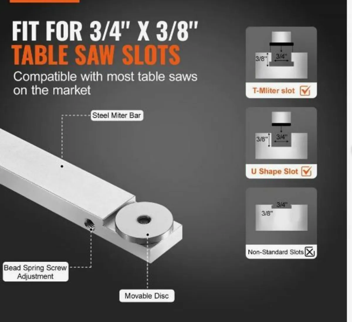 Features & Details Fit for Most Table Saws: Our miter gauge is expertly designed to fit the majority of standard table saw slots measuring 3/4 x 3/8 in ( 19 x 9.5 mm). To ensure a perfect match, please measure the slots on your table saw before purchase. Featuring a detachable disc, our miter gauge is compatible with both 3/4" x 3/8" T-shaped and U-shaped slots. Ideal for most table saw brands, and is upgrade for precision woodworking. Precision Angle Cutting: Experience cutting precision with our adjustable solid aluminum head, engineered with 15 positive stop holes for ultimate accuracy. One stop hole is set at 90 degrees, with seven additional holes on each side at 15°, 22.5°, 30°, 35°, 45°, 60°, and 67.5° to cover most woodworking angles. For more intricate angle cuts, the gauge adjusts proportionally, allowing you to achieve precise angles efficiently and effortlessly. Partially Assembled Components: This miter gauge for table saw is shipped partially assembled to streamline your setup process. When it arrives, you won't need to fuss with numerous small parts. Just attach a few core components, and you're ready to go. It maintains the accuracy of your measurements without the typical assembly hassle. Easy Operation, Simple Adjustment: Our table saw miter gauge features a steel miter bar equipped with an adjustable bead spring plunger on the side. When placing the miter gauge in the table saw slot, if you notice any gaps, simply use the included hex wrench to adjust the plunger. This adjustment ensures an ideal fit within the slot, improving wear resistance and simplifying your operations. Refined Durability in Every Detail: This precision miter gauge is constructed from aluminum alloy, ensuring durability and resistance to deformation. The 19-35 in retractable grating accommodates more sizes of table saws. The angle plate scale is meticulously etched using laser engraving technology, and the textured metal handle provides a secure grip that avoids slipping.