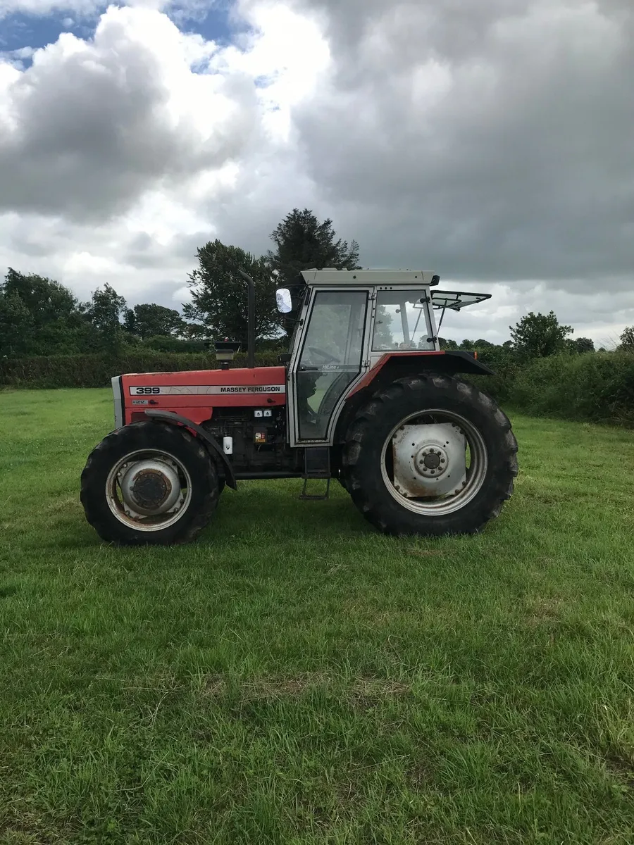 Massey Ferguson 399 lovely clean tractor €26500 No vat. New tyres on back. 45% on front. Shuttle gear. High low and medium. 6 cylinder. New radio. Lights. Farmer owned. Hi line cab. 2 spoils and second hydraulic pump for extra flow. Sun roof. Ring to 0868827927. Reception is bad.