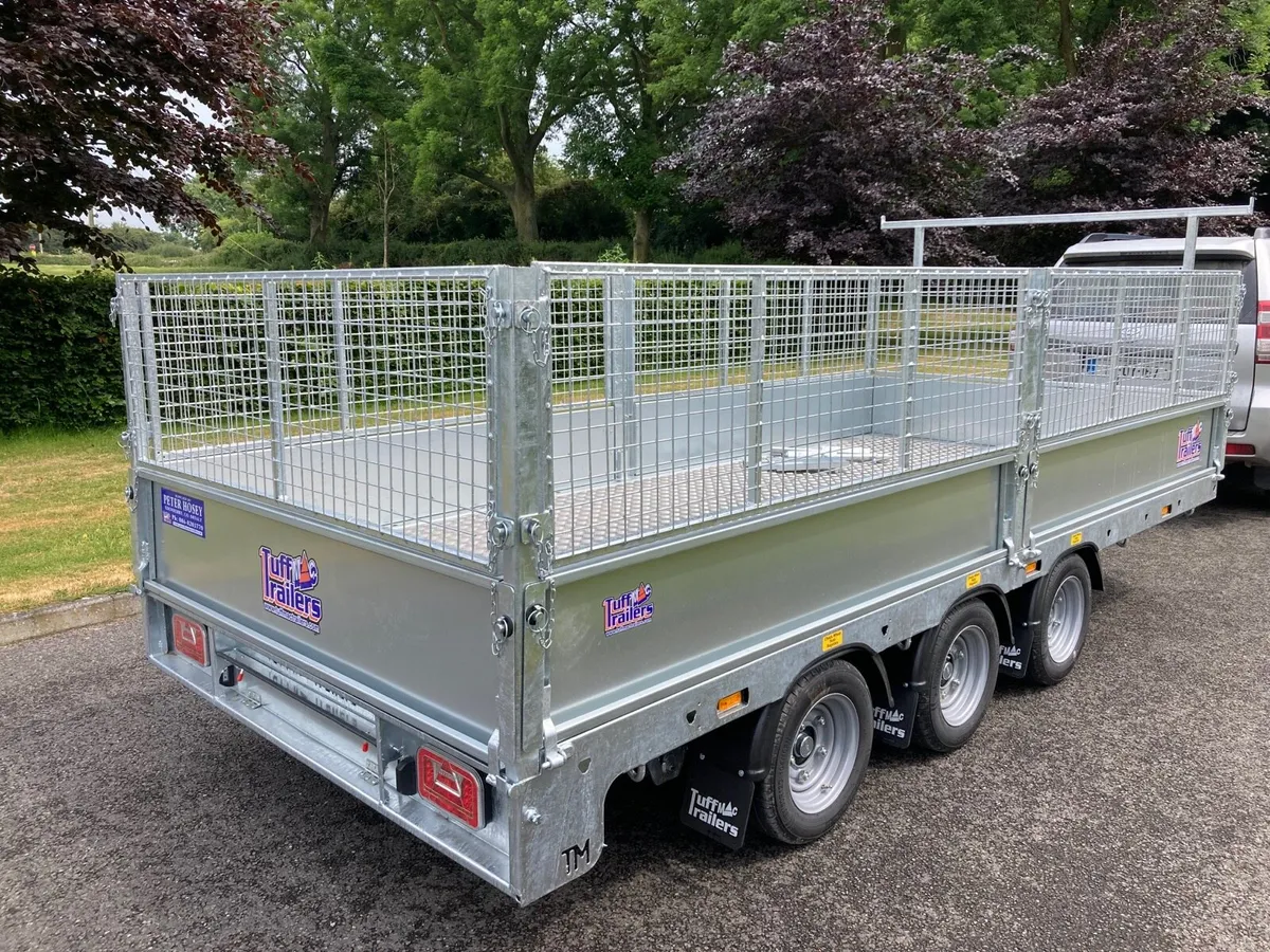 New Tuffmac 14 ft x 6’6 dropside trailer , Full mesh kit, Ladder rack, Aluminium floor, Led lights, Internal floor tie points, Spare wheel, Lockable hitch, 3500kg Peter hosey trailers Edenderry Offaly.